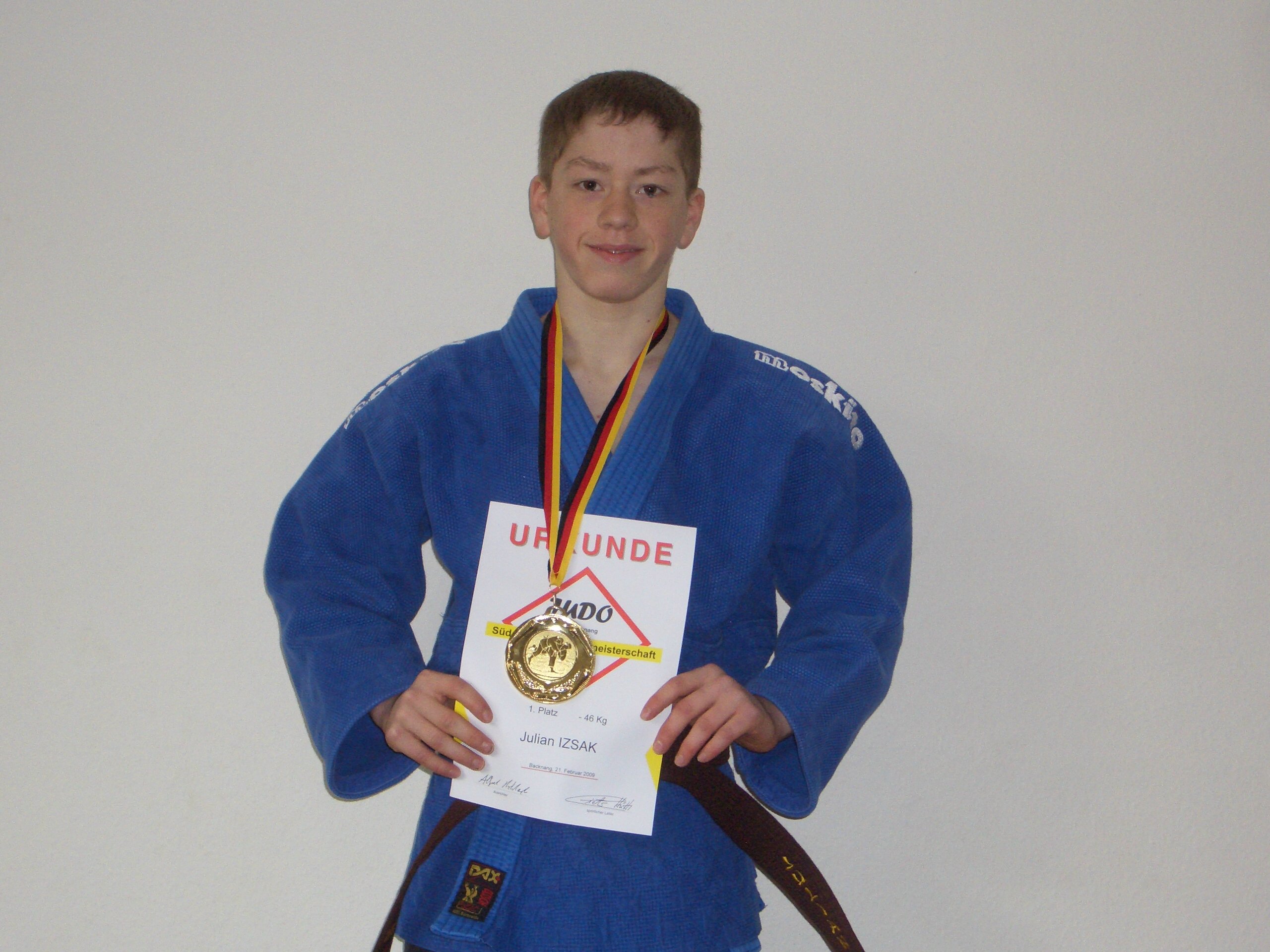 Am 21.02.2009 fanden in Backnang die südd. EM U 17 statt. Nach seinem Auftakterfolg gegen einen Kämpfer aus Backnang besiegte Julian drei starke bayerische Judokas in Folge. Im Halbfinale musste er gegen den stärksten “Bayer” antreten. Trotz Verlängerung erreichten beide Kämpfer keine Wertung. Da Julian der deutlich aktivere Kämpfer war, wurde ihm durch Kampfrichtereintscheid der Sieg zugesprochen. Seinen Endkampfgegner konnte er kurz vor Ende nach einer sicheren Führung souverän mit vollem Punkt (Ippon) werfen. Somit hat er sich für die bereits am nächsten Wochenende stattfindenden deutschen Meisterschaften qualifiziert.